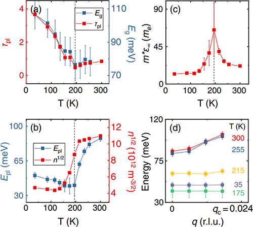 图三 1T-TiSe2中温度依赖的等离激元特征。(a)等离激元的无量纲寿命参数与CDW带隙的比较。(b)等离激元能量与载流子浓度的比较。(c)载流子有效质量与高频介电常数的乘积。(d)等离激元色散随温度的变化。
