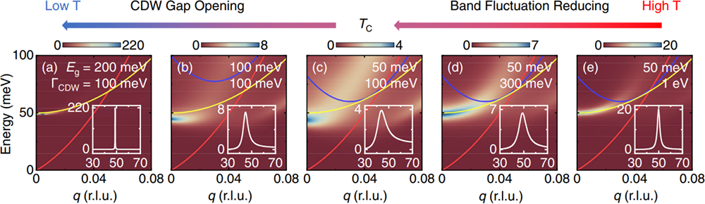 图四 使用包含CDW带隙引起的带间跃迁的唯象模型重现1T-TiSe2中温度依赖的等离激元特征,插图代表q = 0处的能量分布曲线。