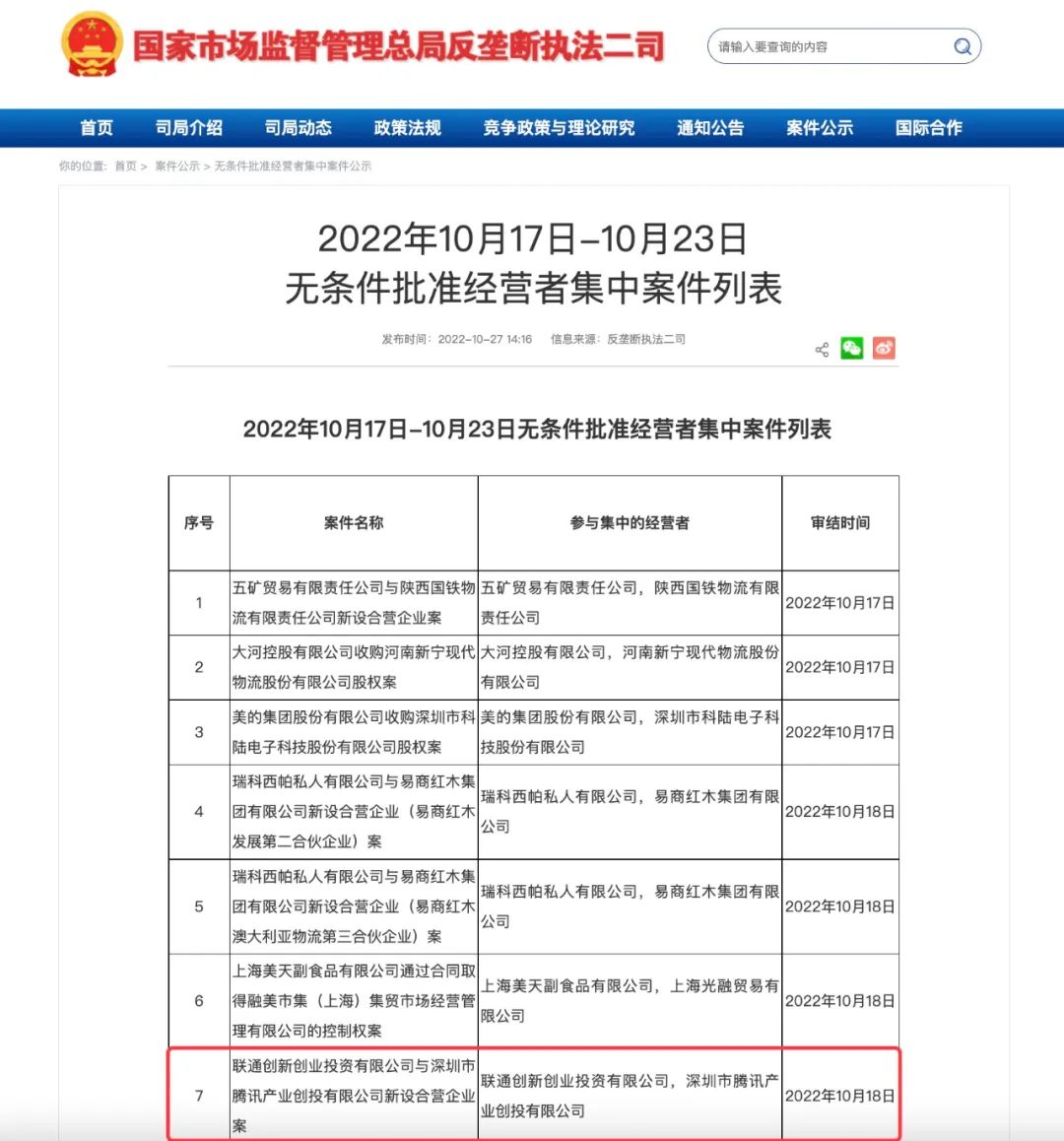 11月2日,据国家市场监管总局官网10月27日发布的《2022年10月17日-10月23日无条件批准经营者集中案件列表》显示,联通创新创业投资有限公司与深圳市腾讯产业创投有限公司新设合营企业案获无条件批准,审结时间为10月18日。