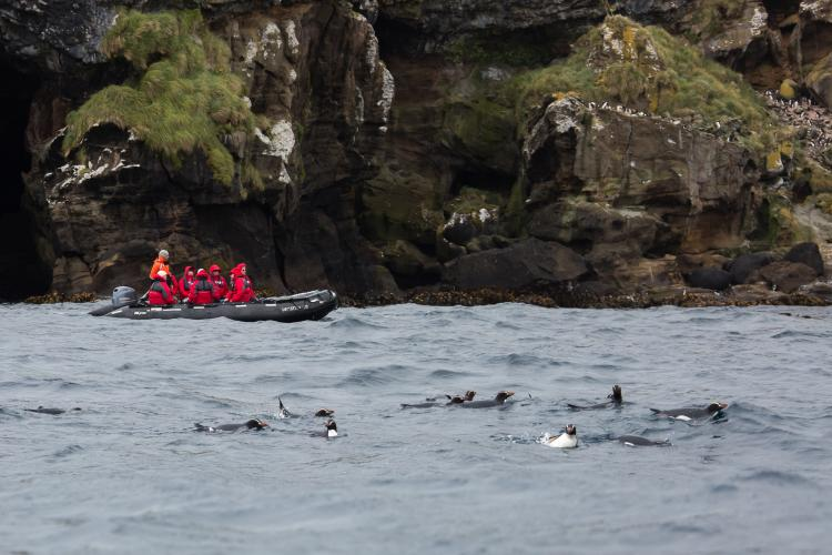 科学家和正在海里游泳的翘眉企鹅,图片来源:New Zealand Automobile Association