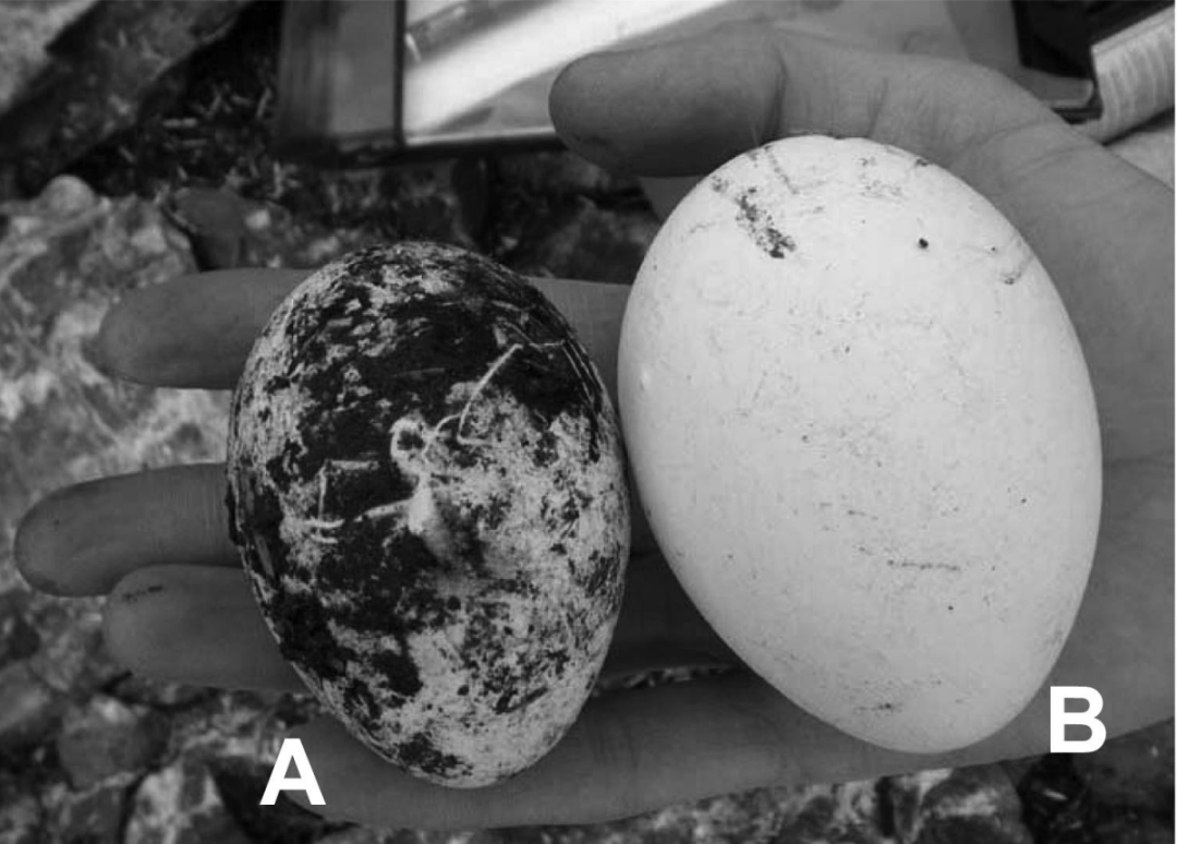 斯岛黄眉企鹅的两个蛋,B蛋比A蛋大,图片来源:参考文献[2]