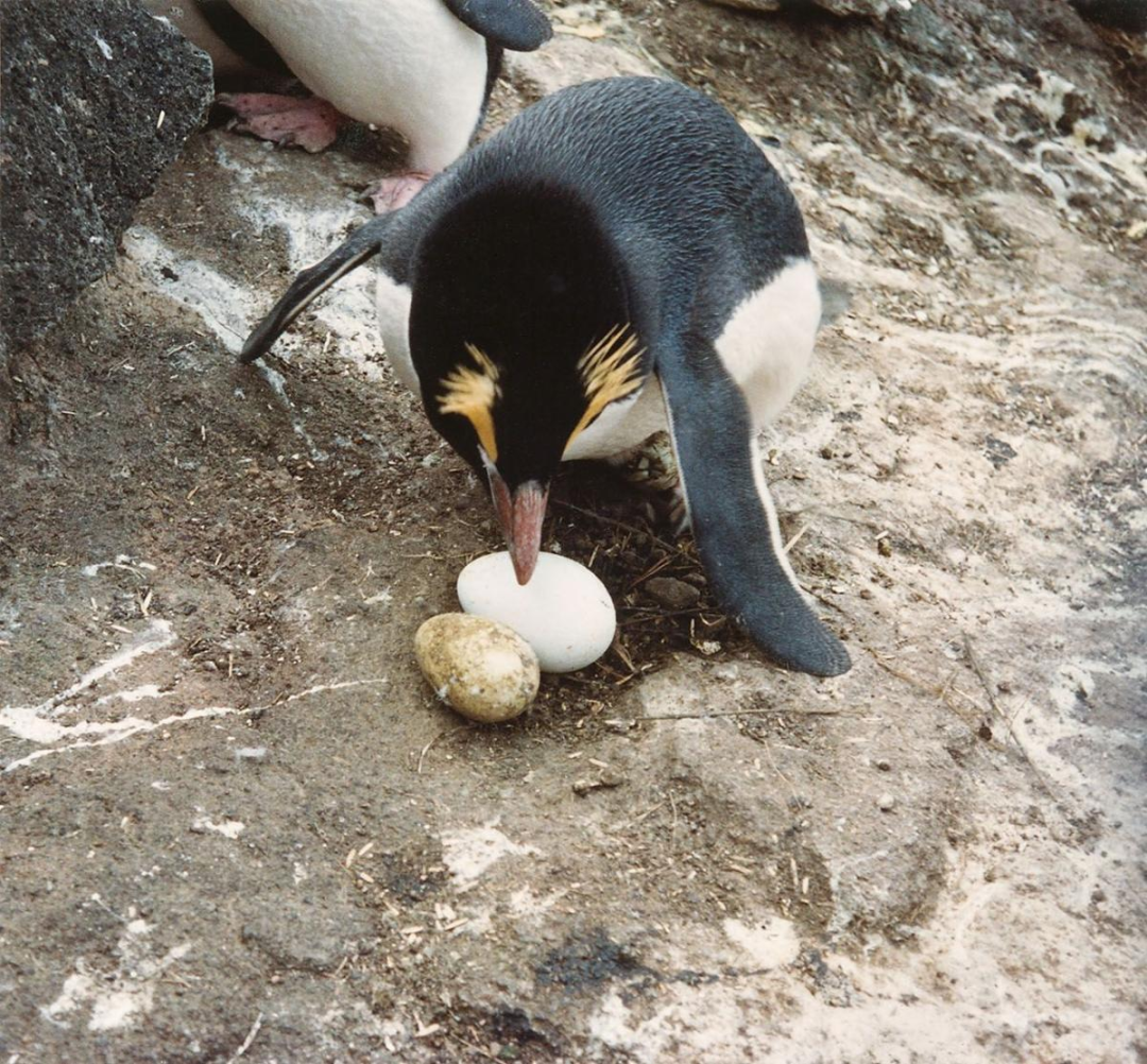其实不只是翘眉企鹅,其他企鹅孵化的蛋里也总会有一个蛋比另一个蛋要大的现象。比如另一种冠企鹅,斯岛黄眉企鹅(Eudyptes robustus),它们的蛋也是一个大一个小。
