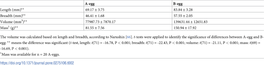 A蛋和B蛋的体积和重量差异,图片来源:参考文献[1]