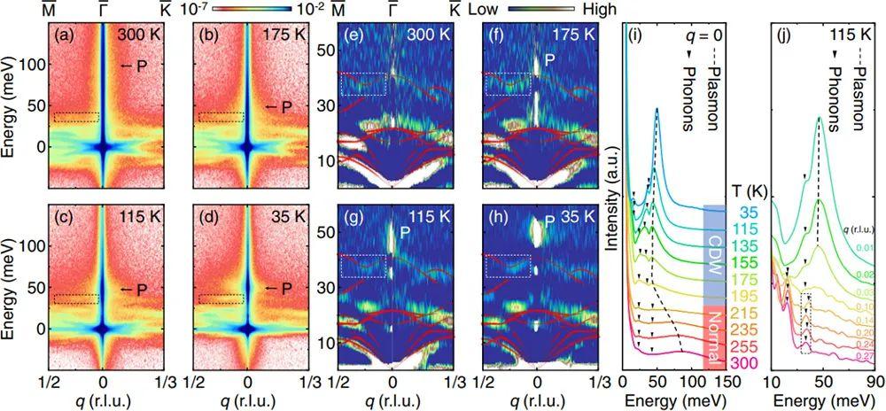 图一 使用高分辨电子能量损失谱测量得到的1T-TiSe₂中的等离激元与声子的变温行为。(a)-(d)原始测量数据,虚线方框标注了声子,符号P标注了等离激元。(e)-(h)是(a)-(d)的二次微分(彩色映射图)叠加上理论计算的声子谱(红色三角形)。(i) = 0处变温的能量分布曲线堆积图。(j)115 K温度下,不同动量的能量分布曲线图。