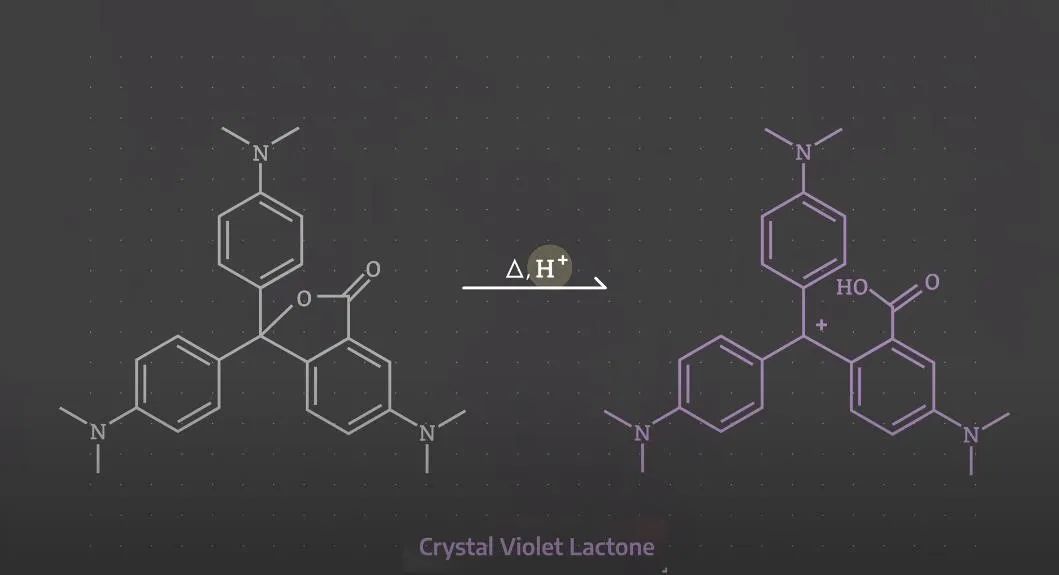 常用于热敏纸的可变色染料结晶紫内酯,左侧是它的无色形态,右侧是加热与酸反应后的显色形态。丨American Chemical Society