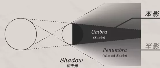 黑滴效应 | 图源:百度百科原理:无论是太阳还是日光灯都不是理想点光源,所以当它照射物体后,物体的影子可以分成两部分:首先是中间被完全遮挡的“本影“(最暗的区域),第二个是模糊的明暗过渡区称为”半影“。当两个物体的半影接近时,重叠部分的亮度会下降很多,这意味着原本我们看不见的”半影“由于接近会变成我们能看见的暗度。