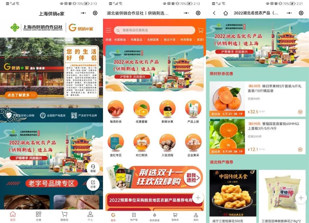 线上在“上海供销e家”“供销荆选”小程序设专区展示,专区内宜昌蜜桔、秭归苹果柿等应季水果限时特价抢购,让湖北瓜果香飘上海。线下,百余件湖北农产品入驻上海“供销e家”品牌集成店(白渡店),产品涵盖米、油、干货、熟食、楚茶各品类,充分展现了“鱼米之乡”的风味风采。