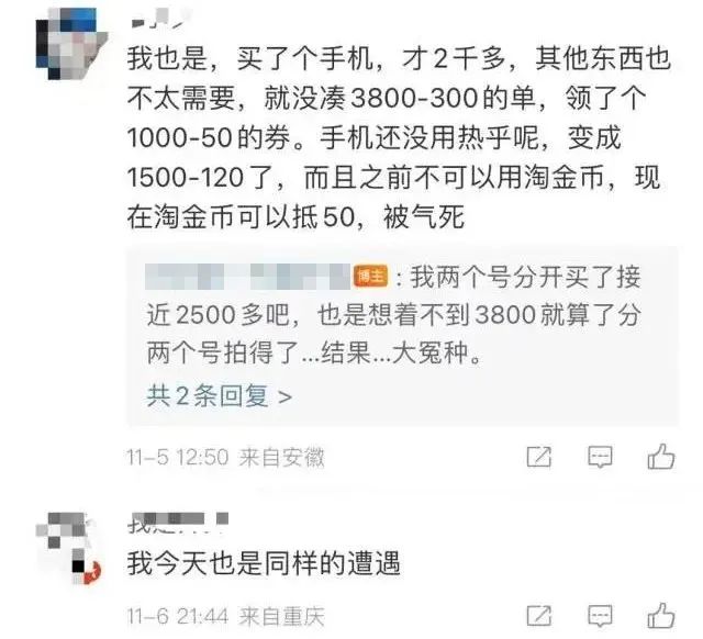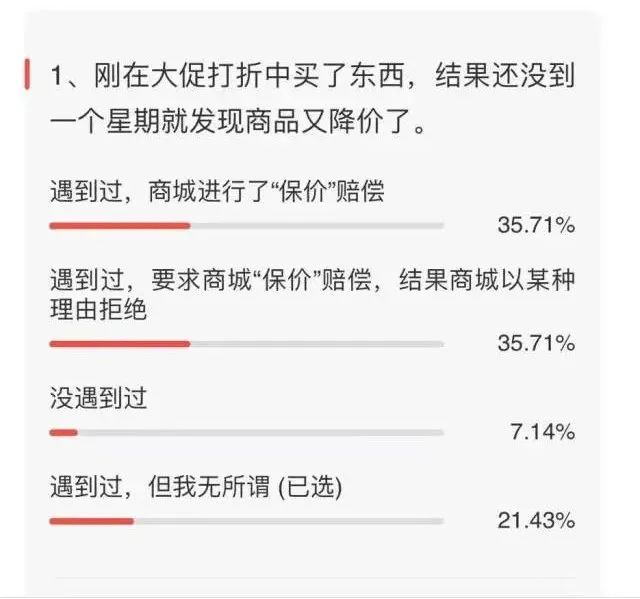 “很气人,商家跟我说不能价保,因为目前的价格降低是因为领券满减的活动所致。”广州的林女士表示,自己在双11第一波预售中买了商品,结果在第二波预售中,商城的领券满减活动发生变化,算下来等于商品的价格又降低了,商家以此为由拒绝自己的价保要求,本来自己想退货重新买,但是发现退货也要运费,只能作罢。