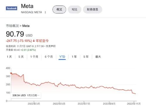 这一系列因素,促使Meta今年股价暴跌。今年年初,Meta股价为338.54美元,11月4日收盘价为90.79美元,跌幅高达73%,是标普500指数成分股里今年表现最差的一家公司。