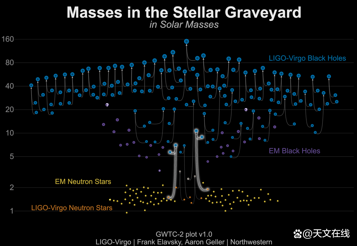 图解:这张图片显示了引力波探测器观测到的碰撞天体初始的质量和最终的质量。