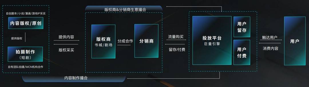 尤其在短剧这条新赛道上,巨量引擎在加大优质短剧激励、扶持力度的同时,也在撮合更多版权商和分销商持续入局,帮助行业各方打破上下游角色边界,提升产业融合效率,让版权资源得到多重利用,让盈利模式多点开花。