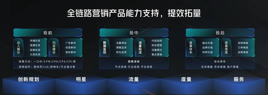基于新的愿景,巨量星图在全链路营销产品能力加持下,能够精准匹配投前、投中、投后各阶段营销诉求,提供抖音传播任务、直播一口价、短视频投稿任务等丰富的内容玩法,助力获客提效。另外,巨量星图流量还能与竞价流量、搜索流量进行协同联动,从而带来更出色的跑量与破圈效果。