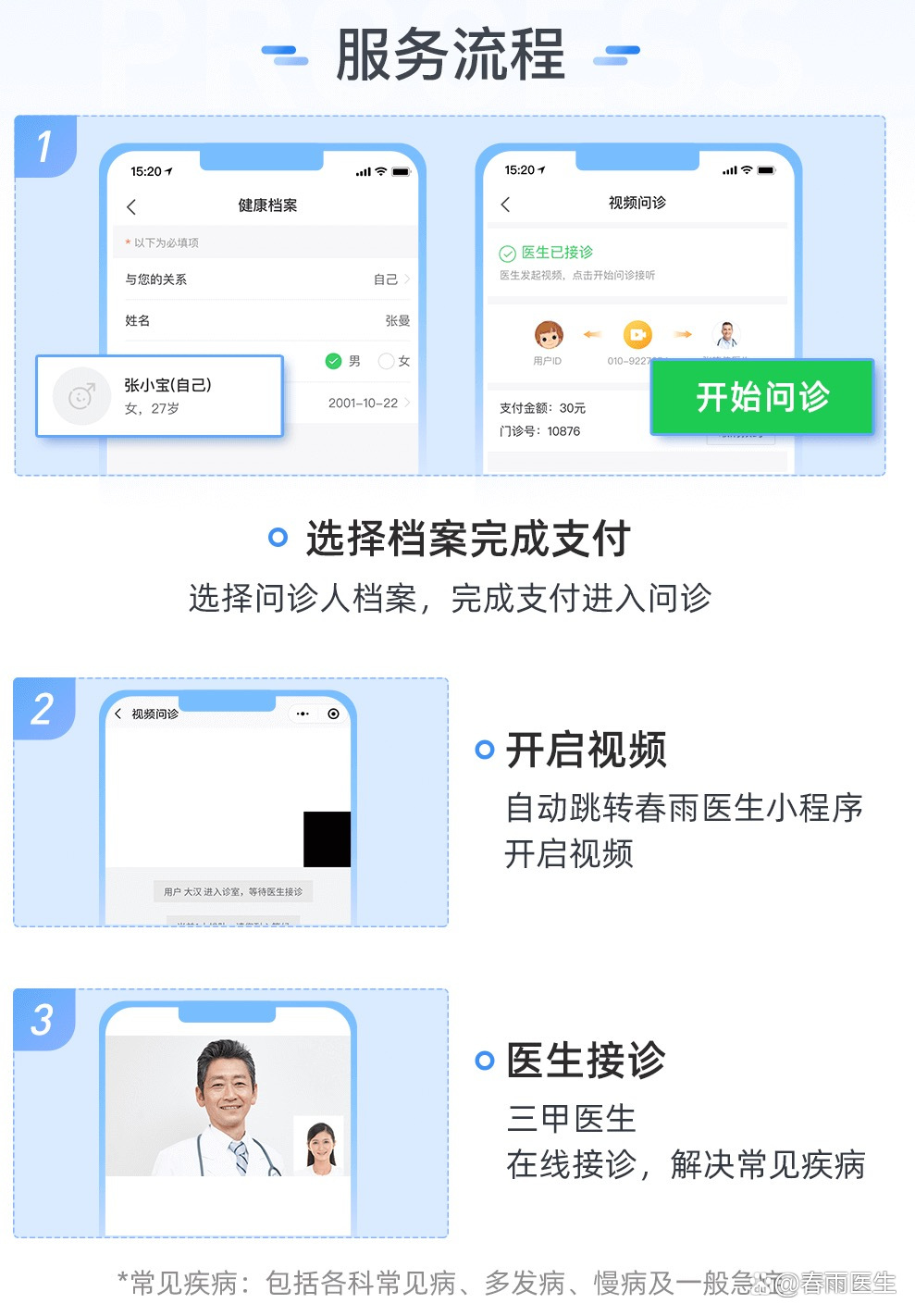 对了,如果还有小伙伴不清楚如何找到春雨医生视频问诊的入口,可以按照下图来操作:
