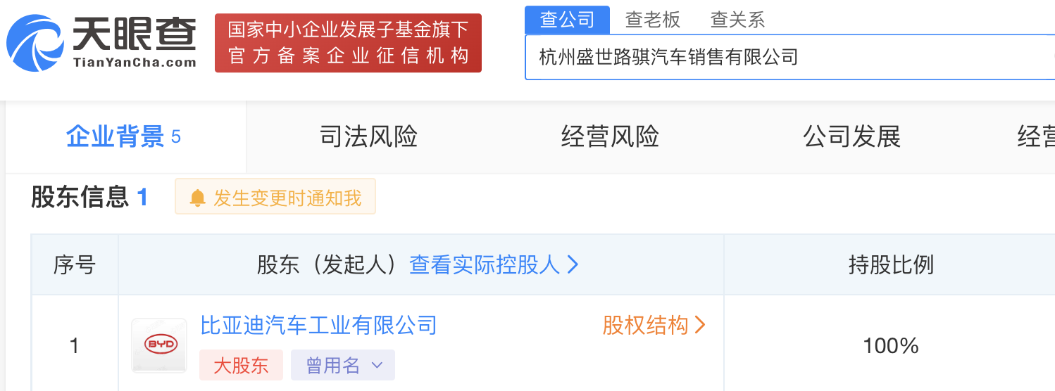 科技边角料获悉杭州盛世路骐汽车销售有限公司日期成立,法定代表人为徐建明,注册资本100万人民币,由比亚迪汽车工业有限公司全资控股。天眼查App显示,近日,经营范围包括新能源汽车整车销售;汽车销售;汽车零配件零售;新能源汽车废旧动力蓄电池回收及梯次利用等。