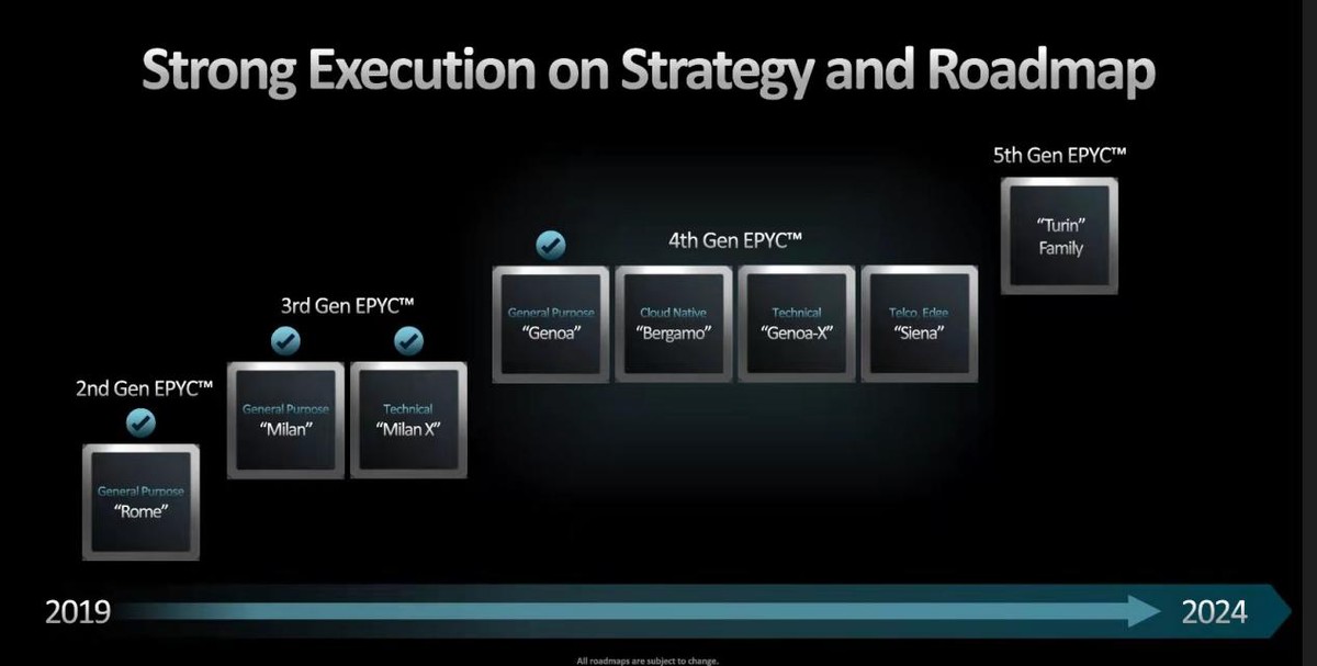 AMD在2017年推出了代号“Naples”的第一代EPYC处理器,从此一直在有条不紊按部就班地沿着Roadmap前进,在2019年推出了代号为“Rome”的第二代EPYC处理器,2021年发布了代号“Milan”的第三代EPYC。AMD在今年财务分析师日上展示的信息显示,第四代AMD EPYC处理器系列,其中代号“Genoa(热那亚)”的系列目标是引领通用计算、“Bergamo(贝尔加莫)”系列将领导地位扩展到云原生。而针对技术计算方面,则由“Genoa-X(热那亚-X)”去跟进。另外还有一个针对电信和边缘优化的产品“Siena(锡耶纳)”,最后路线图的右边是AMD将在2024年推出的“Turin(都灵)”产品系列。