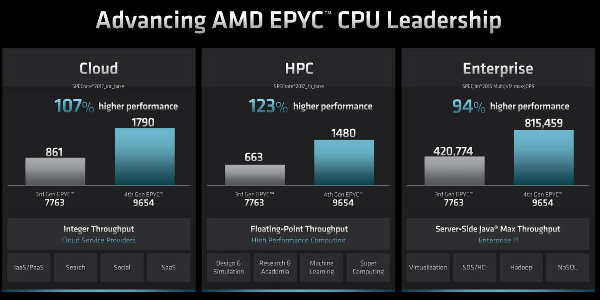 当然,本次发布会第四代EPYC的性能绝对是业界关注的焦点。云计算方面,第四代EPYC在SPECrate_2017_int_base下得分为1790,相对上代提高了107%;高性能计算方面,SPECrate_2017_fp_base中第四代EPYC得到1480分,比第三代EPYC高出123%;企业级计算部分,SPECjbb 2015 MultiJVM max-jOPS包含了多种工作负载,第四代EPYC处理器的性能则提高了94%。总而言之,第四代EPYC比上代提升非常大,即便第三代已经是目前业界最好的服务器CPU,对比第三代EPYC,第四代EPYC处理器性能依然提升了两倍左右。