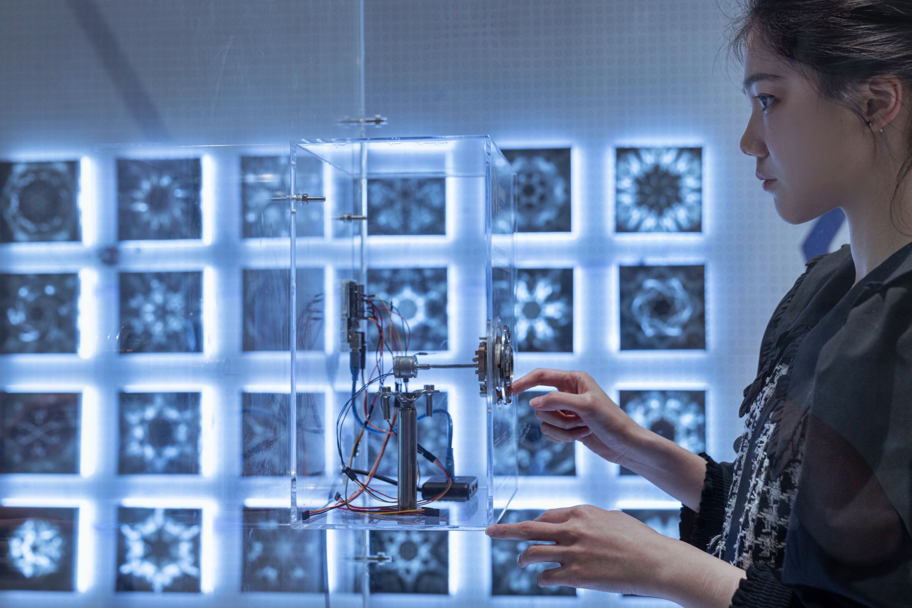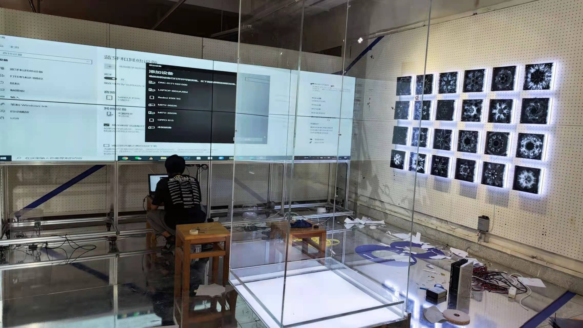 “宇宙电话亭”的艺术创作历时五个月。湖北美术学院学生张俊杰和陈海金,从去年12月开始构思作品。作为视觉传达设计专业的学生,他们想到新媒体艺术和数字生成艺术的结合,“能不能跨学科尝试?”两人的指导老师——湖北美术学院视觉艺术设计学院院长吴萍,积极启发他们,“可以融合多学科思维,科技赋能,呈现不一样的表现方式。”