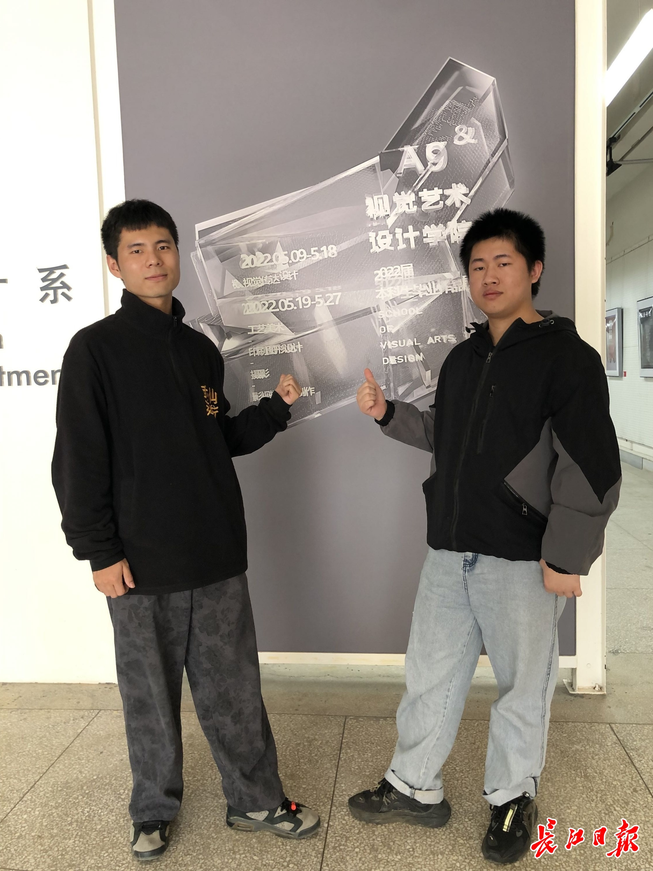 创作“宇宙电话亭”的湖北美术学院学生张俊杰(左)和陈海金。记者胡义华 摄