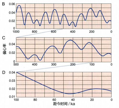 图 地球轨道偏心率变化的示意图及其周期变化(Williams et al., 1998等)