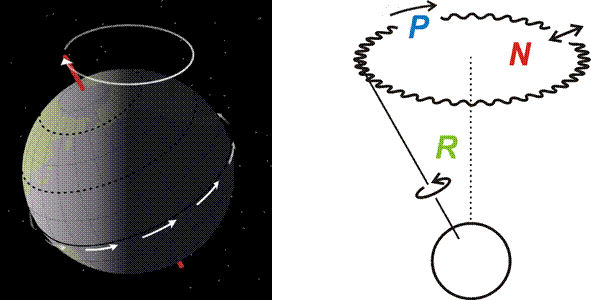 岁差的运动方向(顺时针)以及岁差(P)、章动(N)与地球自转(R)的示意图