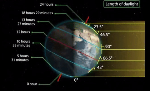 目前,地球的转轴倾角大约是23.44°(23°26')。虽然在一整年之中,地轴倾角都朝着相同的方向,但是由于地球绕着太阳运行,原先朝向太阳的半球会逐渐改变成背离太阳的半球,反之亦然。这种作用是造成季节变化的主要原因。朝向太阳的那个半球每天的日照时间相对较长,并且阳光在正午时间直射地面的角度越接近于垂直的方向,该地区在单位面积内得到的能量也越多。