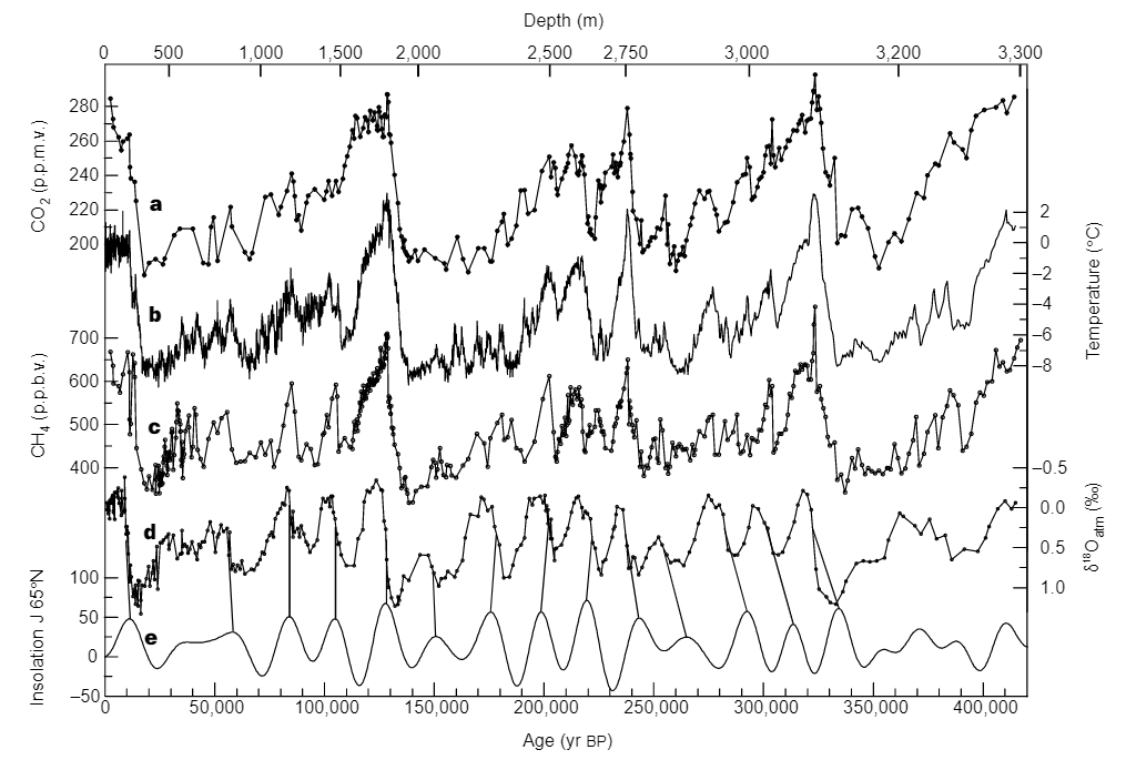 图 Vostok时间序列和太阳辐照量以及CO2、大气同位素温度、CH4、大气δ18O和65°N六月中旬的太阳辐照量随时间的变化
