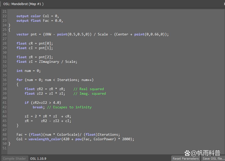 图中是3ds max自带的曼德勃罗集shader,里面的cR和cI(28、29行)就是c的实部和虚部,把它们修改成倒数就可以了。这是osl语言,其他软件也能使用,比如blender、maya等。