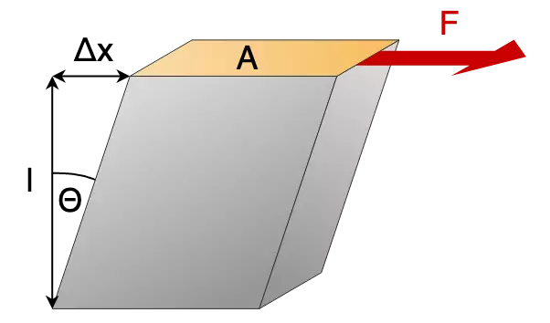 剪切模量是指剪切应力与剪切应变之比。其定义为:G=τ/θ, 其中G(Mpa)为切变弹性模量,τ为剪切应力(Mpa),θ为剪切应变(弧度)。τ=F/A,F为物体收到的切向应力,A为物体的横截面积。θ=Δx/l, Δx为面的位移,l为位移面之间的距离。