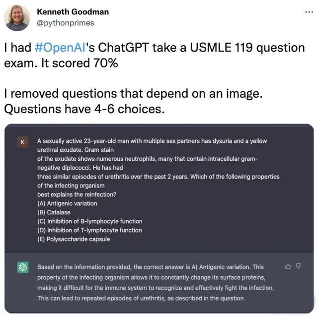 在美国医师执照考试中,ChatGPT 同样拿到了70%的正确率;
