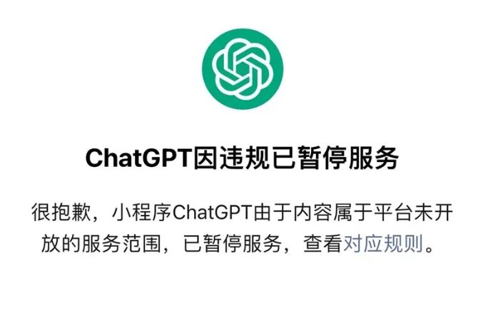 在微信搜索关键词已经找不到任何相关的小程序。ChatGPT 小程序也显示“由于内容属于平台未开放服务范围,已暂停服务。”