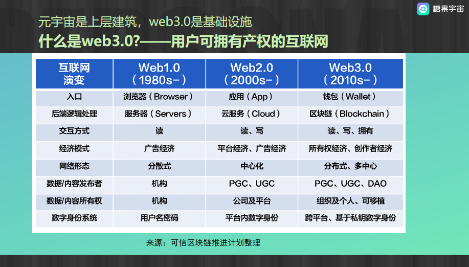 在从web1.0到3.0的演进过程中,从入口到身份系统都在发生变化。这其中最重要的变化,就是我们读取与交互的载体从信息变成了价值。web3.0的用户可以真正拥有自己在互联网上创造的一切价值,不受平台的意志所影响。因此,在元宇宙语境下,用户可以真正拥有自己的账号、身份和创作内容。“拥有=可以任意使用+处置(保留或删除)+获得收益”。这样的“标的”,我们一般称为“数字资产”,有必要和实体资产一样,神圣不可侵犯。让数字内容真正具备资产属性的关键性技术就是区块链,也就是我们所说的NFT。