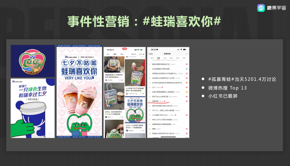 比如,在今年七夕,悲伤蛙和瑞幸咖啡做了一次联名,据说卖出了瑞幸咖啡单日最高销量。
