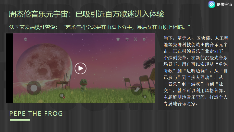 薄盒mints由福建新东湖投资有限公司投资企业北京擘盒科技有限公司创建,并由北京糖小果文化科技有限公司参与项目运营,是国内第一次把流行音乐、流行IP和数字藏品相结合的元宇宙案例。周杰伦元宇宙把《纽约地铁》《青花瓷》《晴天》《搁浅》《爱在西元前》五首经典歌曲Damo制作成音乐空间,邀请悲伤蛙等知名IP作为数字人形象入驻,并将元宇宙的门票和数字人铸造成数字藏品发售,歌迷购买数字藏品后,可以以悲伤蛙数字人形象打开周杰伦元宇宙之门,沉浸式听歌互动。自进入周杰伦音乐元宇宙那一刻起,悲伤蛙数字资产真正“活”了起来。悲伤蛙的加入,让音乐元宇宙从单纯的沉浸式听歌,有了更多想像空间。