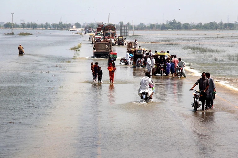 8月,人们穿过巴基斯坦信德省被洪水淹没的高速公路。