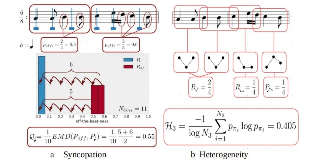 图1:定量衡量音乐异质性和切分节奏的示意图