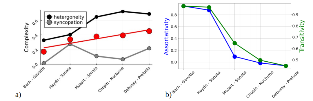 而通过对不同年代作曲家典型乐曲的定量分析(图4),可以发现,从巴赫到德彪西,乐曲的复杂性在上升,而乐曲不同模块之间的同配性和连接性在下降。尽管该方法只是基于少量乐曲,但上述结论是符合直觉的,我们会觉得巴赫的曲子有规律可循,之后的作曲家不断打破规则,在丰富音乐表现力的同时,使得乐曲变得更加不可预测。
