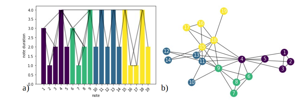 钢琴演奏时,音符持续的时间有长有短,在感知层面上,声音事件的长度在理解声音结构方面起着决定性的作用,一个持续时间更长的音符,可以被看成是英语中的重音,标志着一段节奏的开始或结束。而一段时间内的沉默,也会被听者视为是一个独立的音符。由此,将曲谱中音符的持续时间按长短绘制柱状图,再将长的音符和之后比它短的音符连接组成图。上述的音符连接图拓扑包含了该段的聚类信息,我们可以使用图的度数分布来提取这些信息。具体来说,可通过聚类算法,将乐曲分为多个模块,如图2所示: