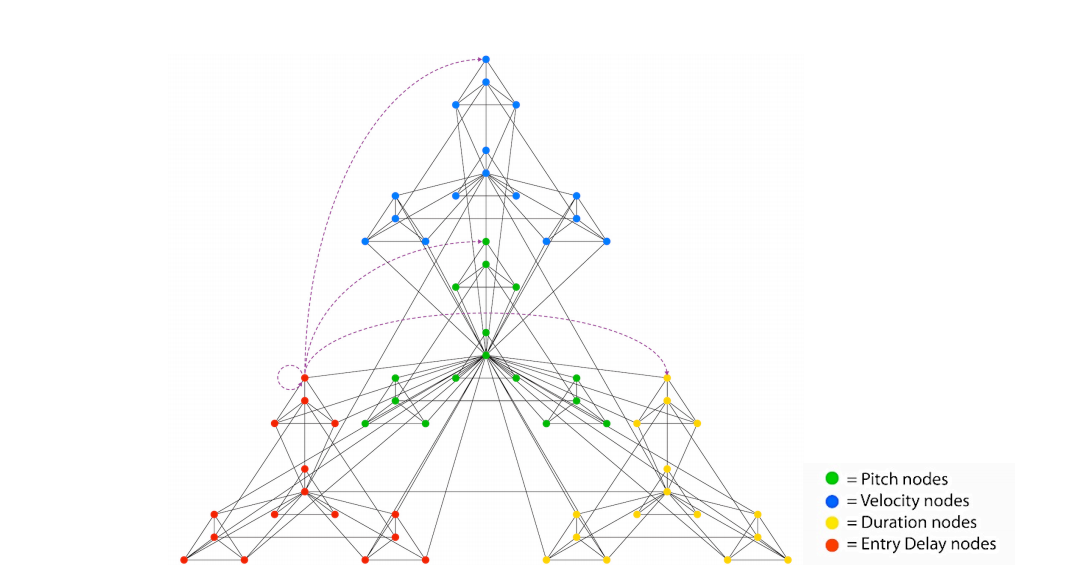 接下来介绍自动作曲工具 NetWorks (NW),其构建基础来自复杂科学提出的关于创造力的解释性理论。该工具能够产生音乐作品,在一定程度上预示了不仅人类对音乐的赏析可以用复杂科学的工具(诸如涌现)加以审视,音乐创作行为也符合复杂系统的规律。