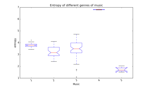 通过对比信息熵,可以评价生成乐曲的音乐性。下图6中,1代表巴赫的合唱曲,2代表爵士乐,3是 NetWorks 产生的乐曲,4是完全随机的乐符产生的乐曲,5是由近乎均匀的规则产生的乐曲。可以看到 NetWorks 产生的乐曲根据信息熵这一指标衡量,和爵士及古典音乐都处在随机混乱度的中间地带,即音乐性较高的“混沌边缘”。