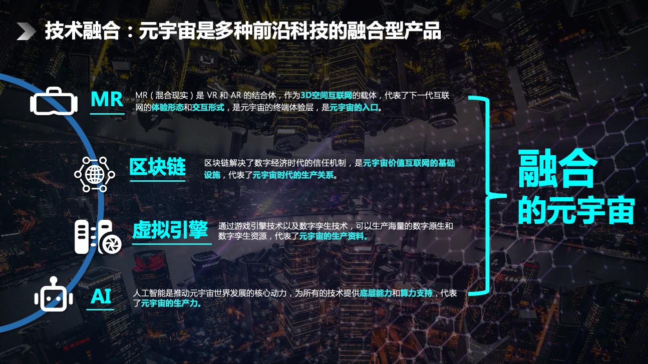 现在来总结一下我们眼中的元宇宙,第一“技术融合”,AI技术将成为所有技术的底层能力和算力支持,虚拟引擎为元宇宙提供生产资料,区块链技术为元宇宙提供数字资产管理的基础设施,最终MR技术将成为元宇宙的终端体验层。第二“虚实共生”,从底层资产层和终端体验层的角度,实现虚实结合,让数字经济可以为实体赋能。第三“应用场景”,将前面所说的功能应用于具体场景,帮助线下导流、降本增效,在商业场景中创造价值。