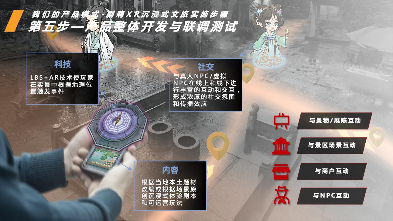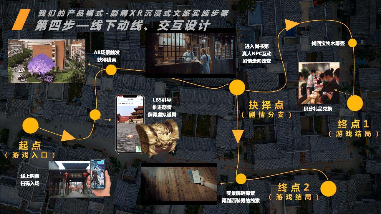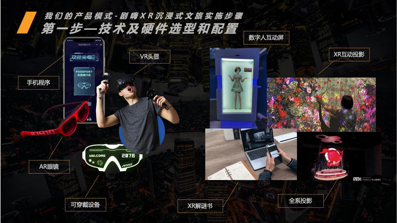剧嗨的主要工作就是将内容、场景、数字资产等融合集成,然后通过我们的方案策划、产品开发和联合运营,最终产品将在手机端、PC端和MR眼镜端呈现,是用户可以在线下和线上都能够得到沉浸式的内容体验。下面简单介绍一下,XR沉浸式文旅的实施步骤。