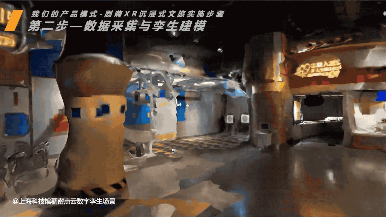 第二步,到线下进行数据采集与孪生建模,将线下场景搬到线上,作为元宇宙XR产品基础开发的底层平台,这是我们在上海科技馆采集和创建稠密点云数字孪生场景的过程。