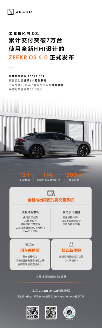 12月16日,极氪智能科技宣布旗下豪华猎装轿跑极氪001累计交付量突破7万台,并同时发布了在交互体验和视觉设计上全面焕新的ZEEKR OS 4.0系统,该系统将在近期对用户进行推送,此次推送也是今年年内极氪001再一次的重大版本OTA升级。至此,极氪001继续坐稳“中国品牌30万以上纯电车型销量冠军”头衔, ZEEKR OS 4.0系统也是极氪给用户在软件层面交上的年终答卷。极氪001的持续进化,实现了在一流机械素质基础上,软件能力高频迭代升级,持续满足用户需求。