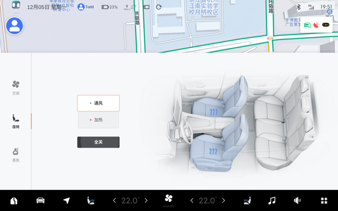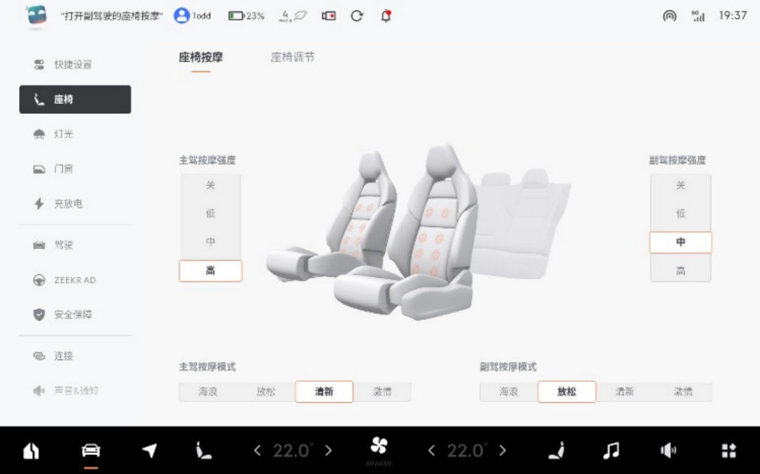 得益于Unity- 3D实时渲染技术的应用,ZEEKR OS 4.0为用户带来了直观易懂的3D可交互座椅,便捷调节,实时显示。为进一步提升交互体验,空调、座椅加热/通风、香氛设置等部分高频应用进行了轻量化的半屏设计,在不影响主信息显示的基础上,让多种功能调节聚合于同一画面。