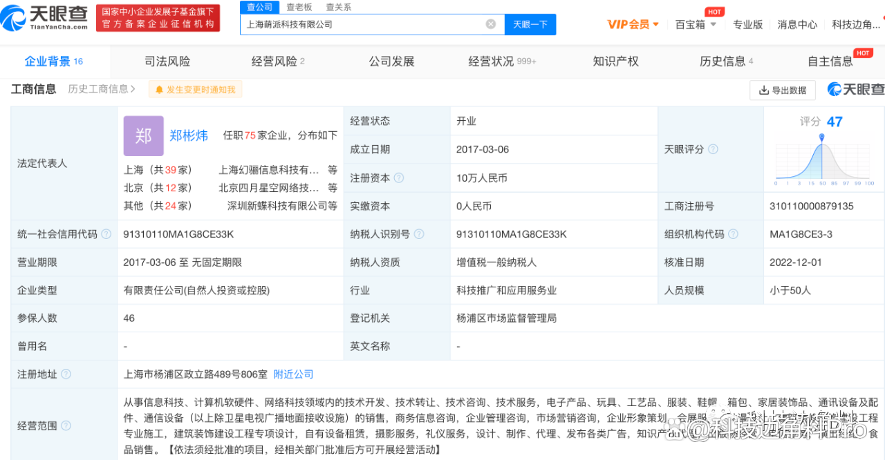 天眼查App显示,萌派科技成立于2017年3月,法定代表人郑彬炜,注册资本10万元,公司经营范围含从事信息科技、计算机软硬件、网络科技领域内的技术开发等。