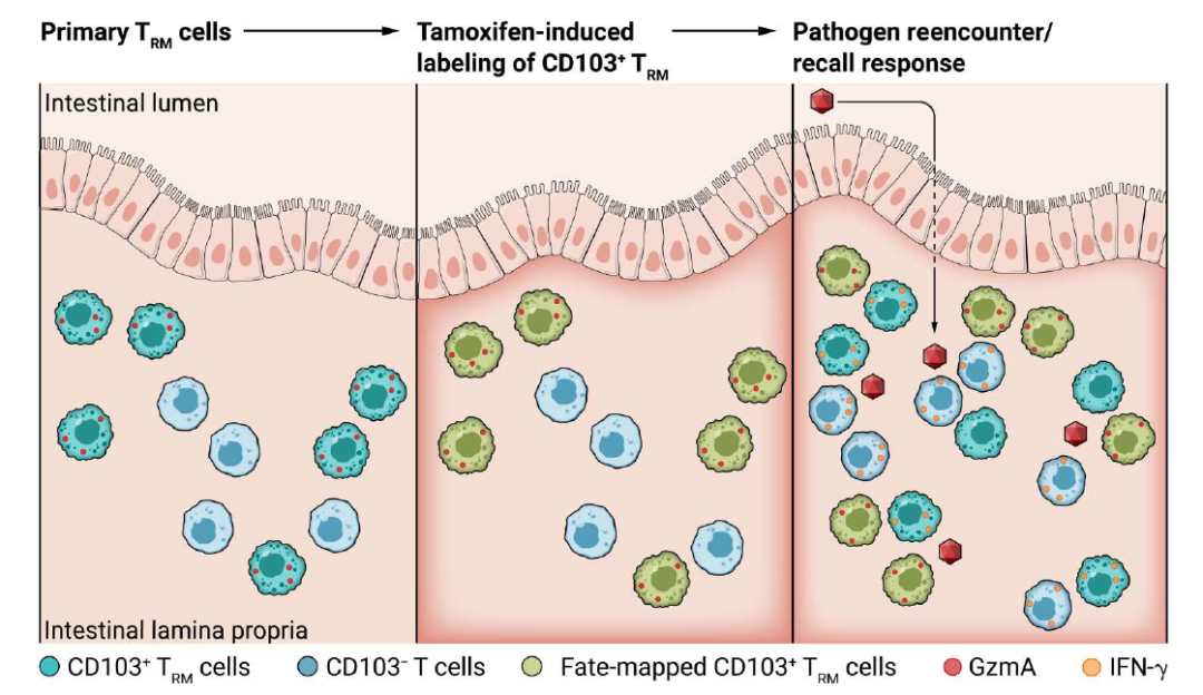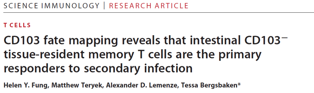 近日,Science Immunology上发表了两篇关于肠道TRM细胞产生、二次感染后TRM细胞命运变化的文章:来自新泽西医学院的Tessa Bergsbaken 团队发表了题为CD103 fate mapping reveals that intestinal CD103−tissue-resident memory T cells are the primary responders to secondary infection的文章。