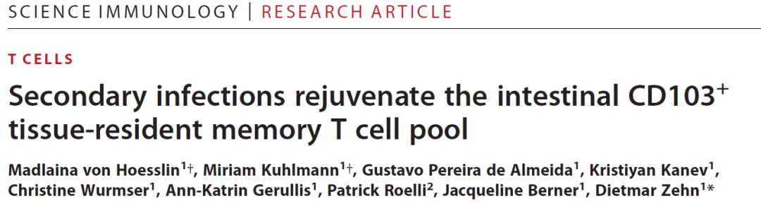 来自慕尼黑工业大学的Dietmar Zehn 团队发表题为Secondary infections rejuvenate the intestinal CD103+ tissue-resident memory T cell pool的文章。这两篇文章都对二次感染后肠道中CD8+TRM的异质性和功能特点以及记忆细胞库的扩增来源进行了分析。