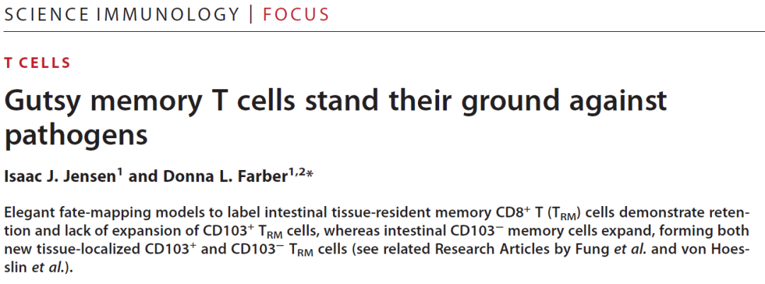 来自哥伦比亚大学的Isaac J. Jensen 和Donna L. Farber合作为这两篇文章发表了题为Gutsy memory T cells stand their ground against pathogens的评论 文章。