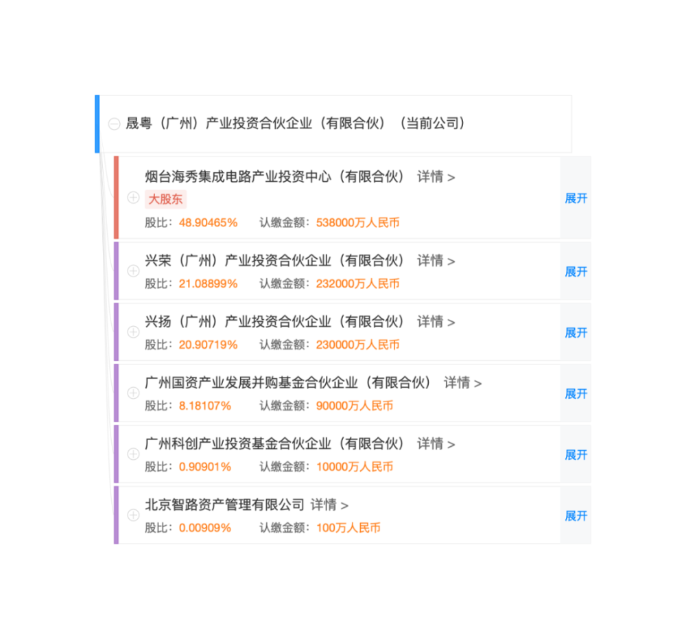 而据天眼查显示,烟台海秀已经出现在晟粤广州的股东名单中,持股比例为48.90%,兴微基金的名字则不再出现。国家企业信用公示系统则显示,早在今年10月10日,晟粤广州就已有合伙人变更,兴微基金退出,烟台海秀加入。