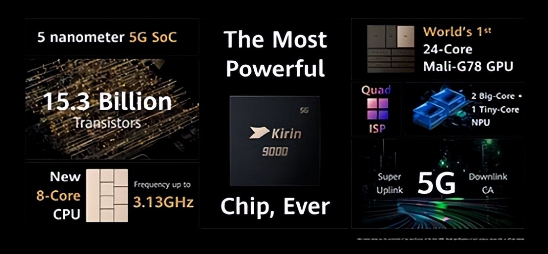 麒麟 9000 采用 5nm 制程,内置 8 核CPU核心,包括一个最高频率为 3.13GHz 的 Cortex-A77 大核,3 个 2.54GHz 的 A77 中核,4 个 2.04GHz 的 A55 小核。